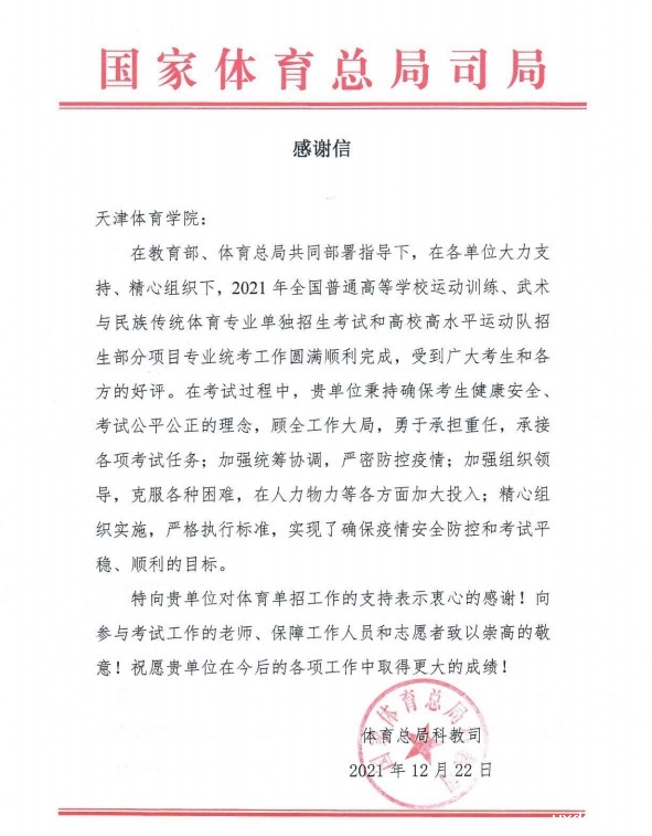 近日,我校收到国家体育总局科教司发来的感谢信,对我校确保疫情防控安全下圆满完成2021年体育单招组考工作,实现“双战双赢”表示感谢。感谢信体现了国家体育总局对我校体育单招组考工作的充分肯定与支持,更是对所有考试工作人员的莫大鼓励。