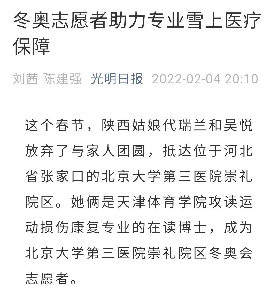 这个春节,陕西姑娘代瑞兰和吴悦放弃了与家人团圆,抵达位于河北省张家口的北京大学第三医院崇礼院区。她俩是手机版伟德app客户端下载官网网址在哪看攻读运动损伤康复专业的在读博士,成为北京大学第三医院崇礼院区冬奥会志愿者。