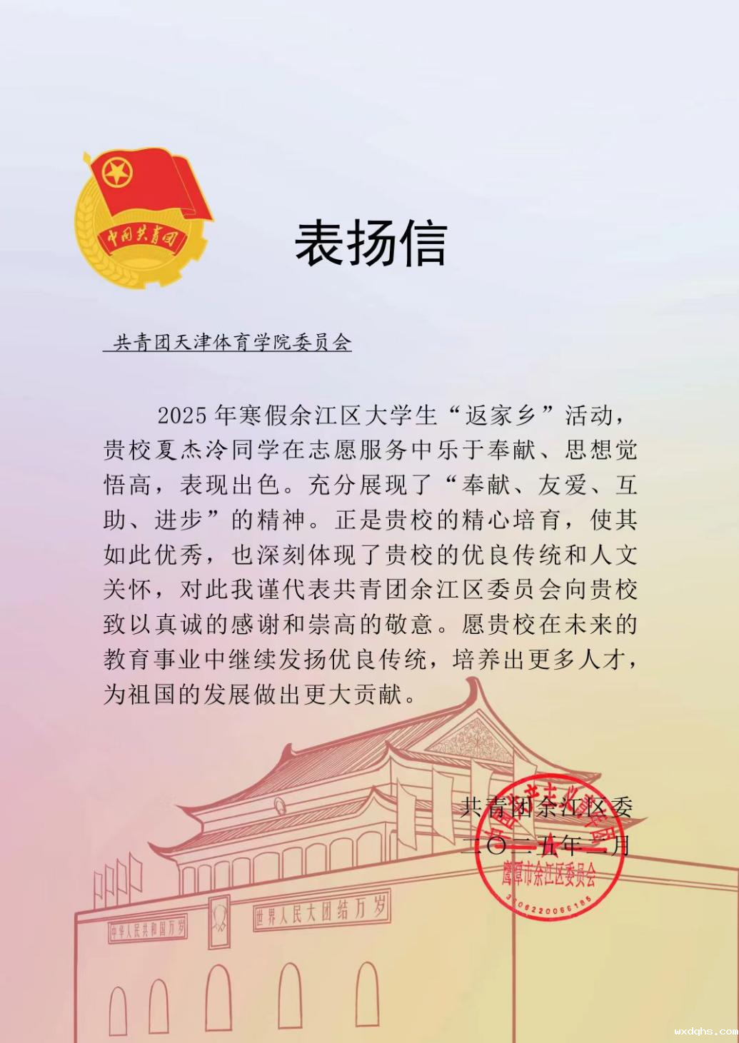 2月20日,手机版伟德app客户端下载官网网址在哪看团委收到了一封来自江西省鹰潭市余江区团委的表扬信,信中高度赞扬了这位学子在家乡的卓越表现。