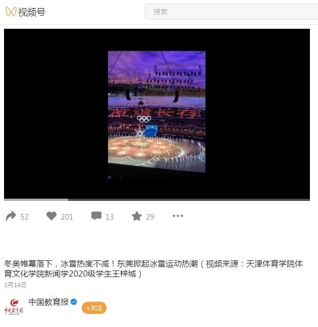近日,我校体育文化学院2020级新闻学专业王梓城拍摄的视频《东莞掀起冰雪运动热潮》,在中国教育报官方微信视频号发布。