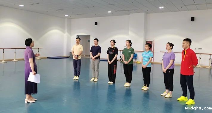舞蹈馆六号舞蹈教室,7名教师正在积极备战全运会气舞项目比赛。为更好地将党史学习融入日常训练之中,田丰走到老师们中间,为老师们开展党史学习教育宣讲。