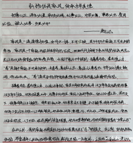 为深入学习贯彻习近平总书记关于家庭家教家风建设重要论述,进一步引导青年学生树立正确的世界观、人生观、价值观;倡导和培育清廉家风、传播清廉价值理念;为风清气正的校园氛围注入清廉力量,运动训练学院党委和纪委暑假期间开展了“颂家训 传家风 倡清廉”新生的一封家书征集活动,通过亲子交流,萃取家训精华;笔墨书写,铭记清朗家风;畅谈廉洁故事,践行廉洁家风,充分挖掘学生身边的家风家训文化,引领和营造家风清朗的教育氛围。