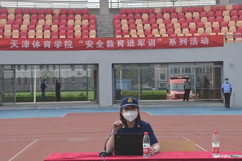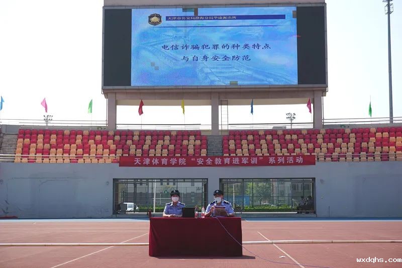 在田径场,静海区消防救援支队宣传教员为同学们讲解火灾危害、用火用电安全、灭火技能、火场逃生等消防安全知识,展示了消防车辆、特种消防器材,演示了灭火器、灭火毯、消防水枪、自救式呼吸器等消防设备的使用方法。团泊西中队指战员指导大学生现场使用灭火器、消防水枪等消防设备。华康派出所民警开展防电信诈骗讲座。