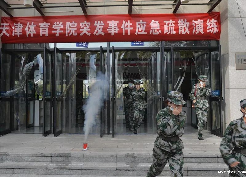在疏散演练环节,突发事件的演练场景为烟雾弹模拟的火灾场景。接到学生火灾报警后,校消防控制室立即启动1-9号宿舍楼消防报警系统。同学们用湿毛巾捂住口鼻,在疏散引导员和军训教官的指引下迅速有序撤出宿舍楼,并按照既定的应急疏散方案、路线,撤离至指定地点。党委安全工作部配合团泊西中队消防员迅速扑灭模拟火源,让师生身临其境地感受火灾场景。
